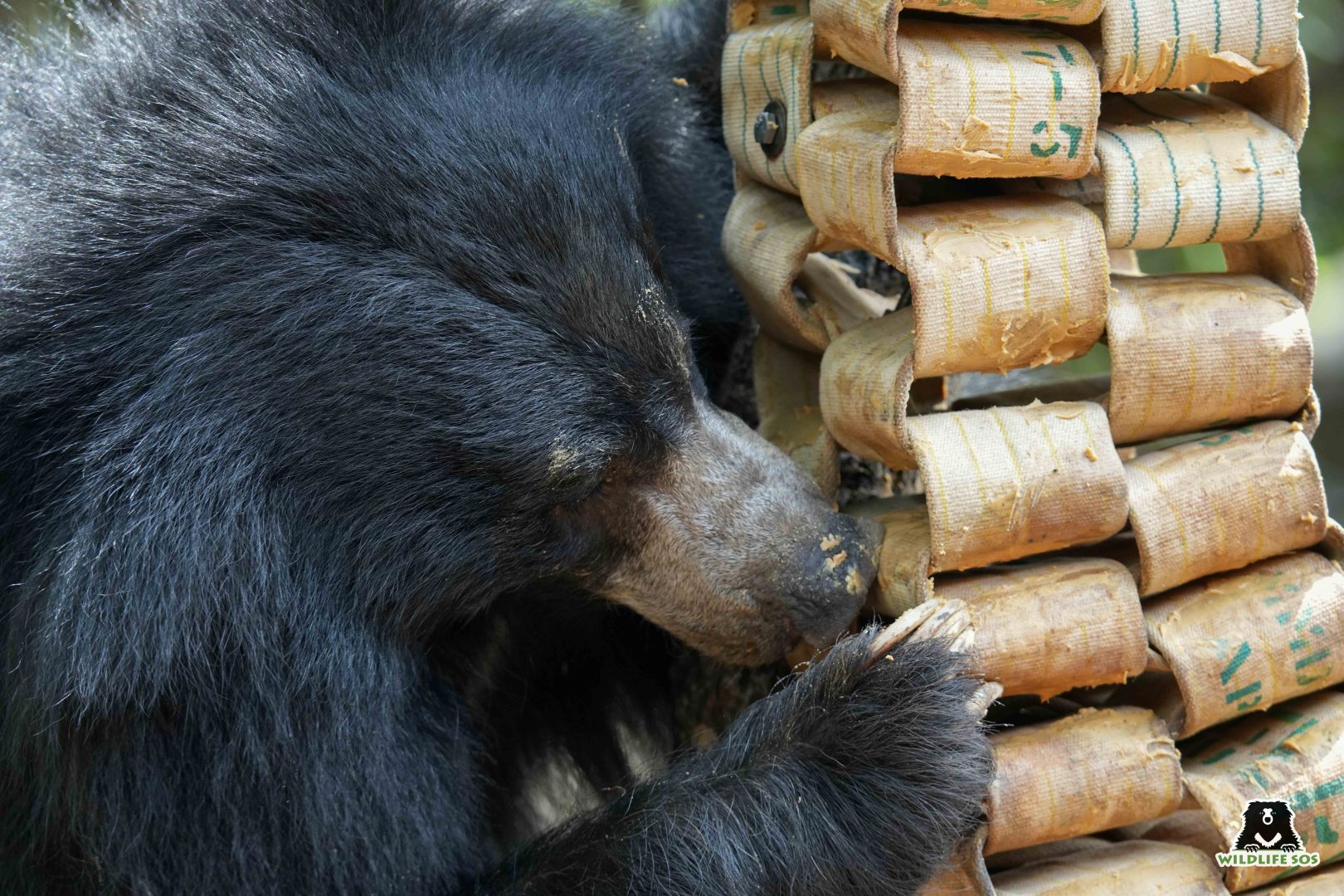 Wild sloth bears are primarily myrmecophagous, which means they feed on a host of insects. While Hamsi uses her long claws to extract termites and ants out from her field at BBRC, she has a weakness for honey and peanut butter, and would never pass up the opportunity to feast on these delicious treats available to her!