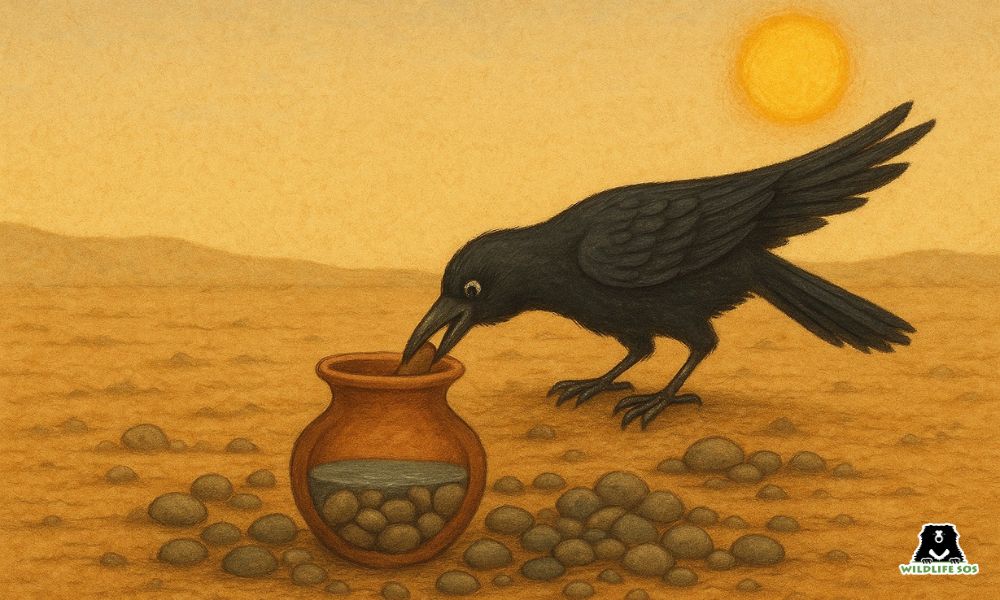 Once upon a time, under a scorching summer sun, a thirsty crow flew far and wide searching for water. At last, it spotted an earthen pitcher, but the water inside was out of reach. Just as all hope seems lost, the crow noticed nearby pebbles. Plop… plop… plop… One by one, it dropped them into the pitcher, raising the water level until it could finally drink it and fly away!