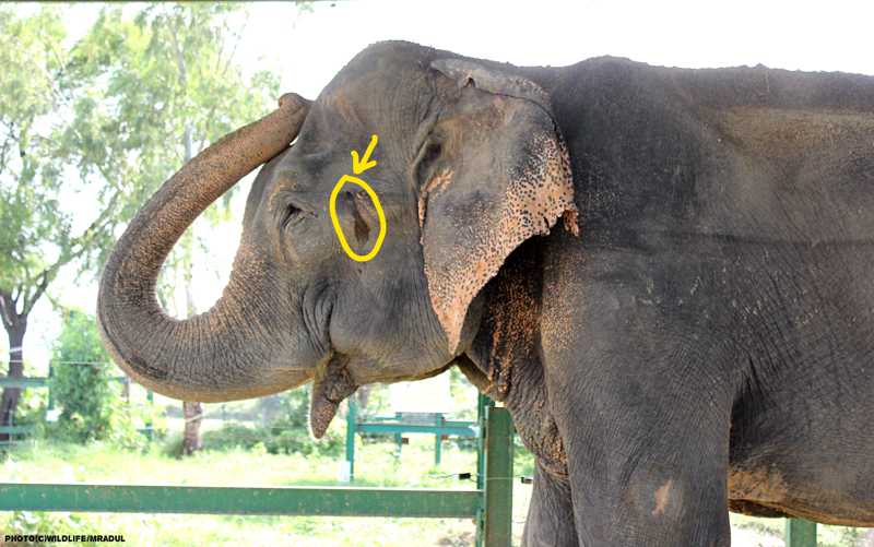 The temporal gland is present on the elephants ‘temple’ area – between the eye and the ear. There is a tiny but visible perforation in the skin at the temporal gland from which a substance known as temporin is secreted when a bull is in musth. This manifests itself as a trickle of liquid down the sides of the elephant’s head, originating from the temporal gland.