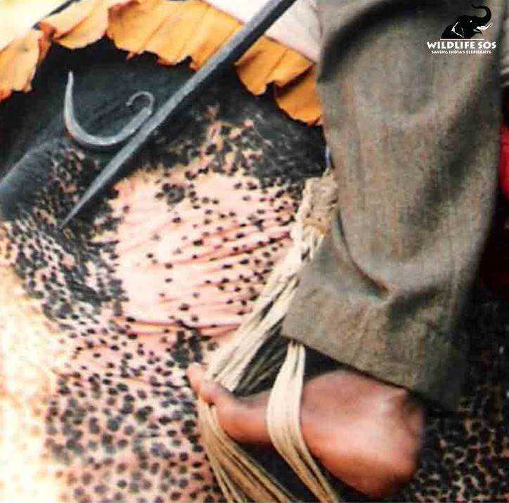 - The very act of riding is cruel – an elephant’s back was not designed to carry weight and yet the weight of the carrier, the mahout/keeper and the tourists on its back can put an intense amount of pressure on the animal’s spine. These weights can often exceed 200-400 kilograms of the ‘howdah’ and in addition to it the weight of the mahout and three adult passengers easily exceeds 600 kilograms—causing sores bruises, cuts and deformities in the animal’s back, but most importantly it leads to early arthritis and severe joint pains.