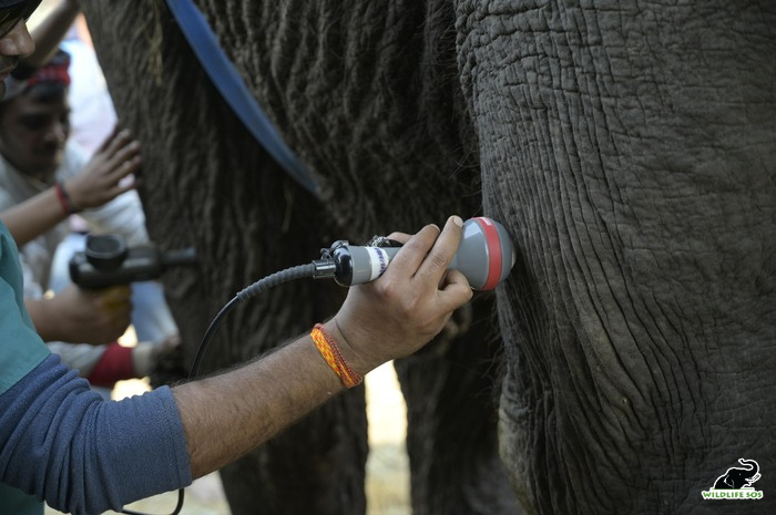 - Laser therapy was immediately initiated to reduce the inflammation on Manu’s joints, and his wounds were cleaned to prevent further infection. [Photo © Wildlife SOS/Atharva Anil Pacharne]