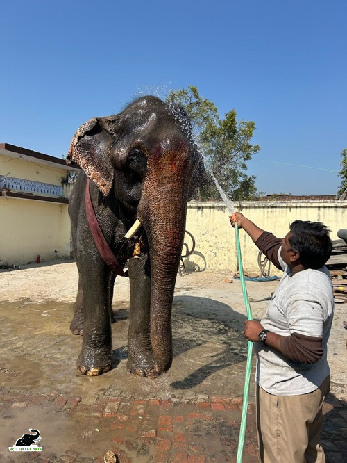 - Bathing is also essential to maintain Manu’s oral hygiene and to prevent any infections. [Photo © Wildlife SOS/Mradul Pathak]