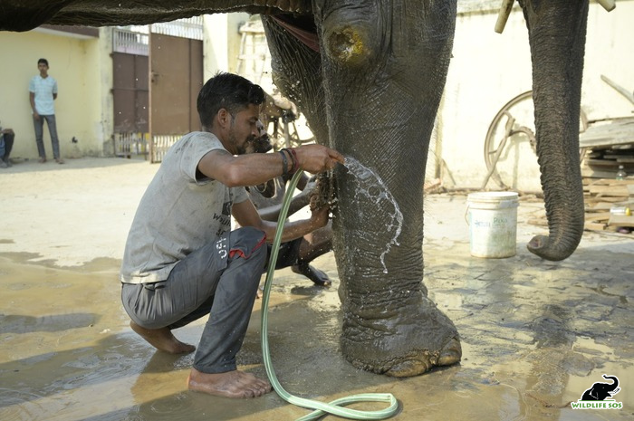 - Manu is given a warm and soothing bath by our earnest caregivers at the site. [Photo © Wildlife SOS/Atharva Anil Pacharne]