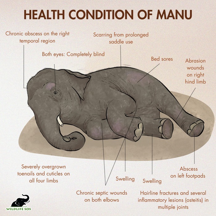 - Years of neglect, combined with untreated injuries and chronic ailments, had left Manu in poor physical condition. [Photo © Wildlife SOS/Atharva Anil Pacharne]
