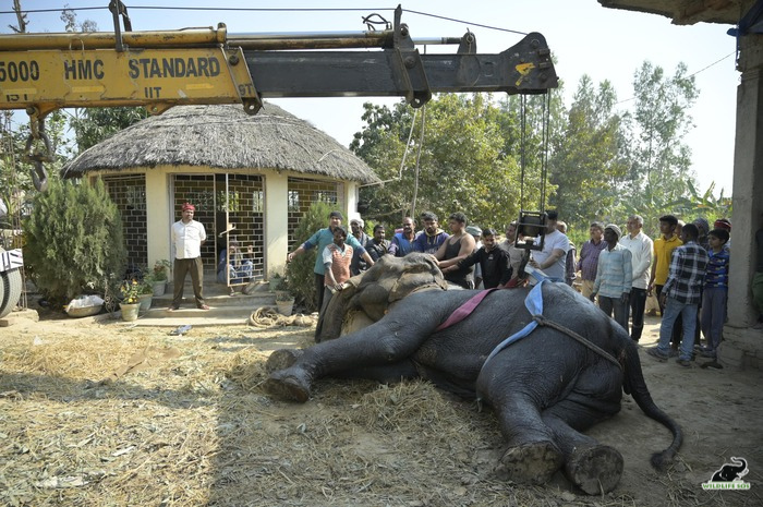 - A crane was brought in to safely lift Manu, who had been lying in this position for over 36 hours. [Photo © Wildlife SOS/Atharva Anil Pacharne]