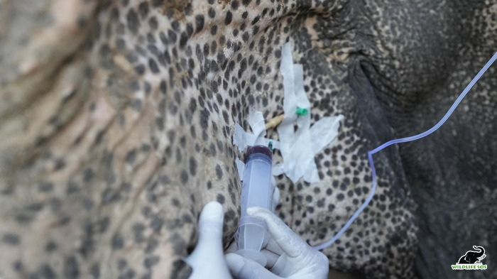- Manu receives vital antibiotics, vitamins, and fluids to aid his recovery. [Photo © Wildlife SOS/Mradul Pathak]