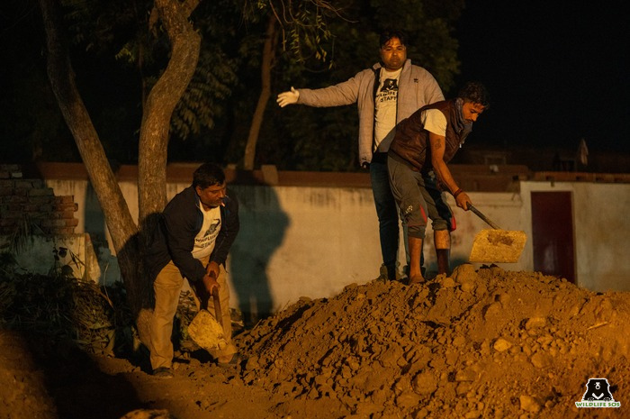 - A JCB excavator was used to create the trench where the vehicle stood, and a sling system was carefully set up inside the ambulance to provide Manu support in case he needed assistance to stand. [Photo © Wildlife SOS/Mradul Pathak]