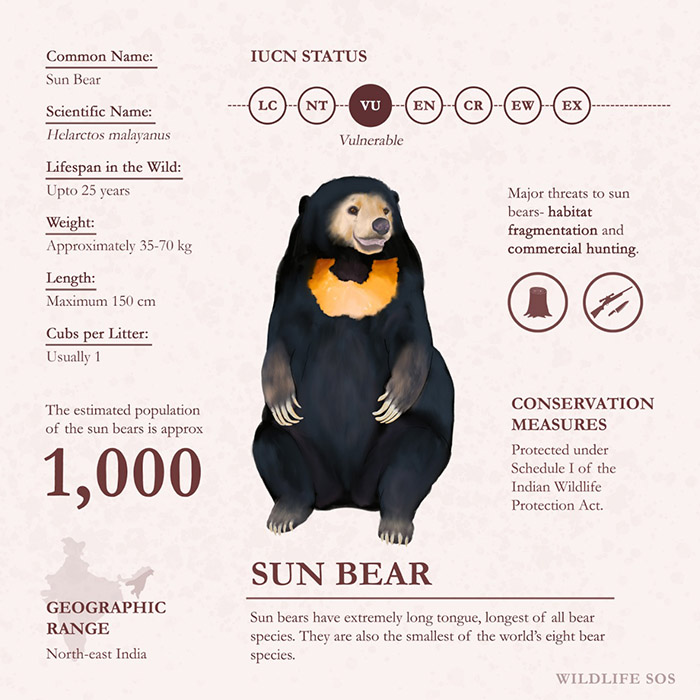 Even though sun bears are listed under CITES Appendix I, they do face a lot of threats, the major one being deforestation. Apart from that, they are often killed to prevent crop damage and for fear of bears near villages. Large-scale deforestation has dramatically reduced the suitable habitat of this species as well as habitat quality of the remaining forests. It is suspected that the global population of sun bears has drastically declined by 30% in the last three decades.