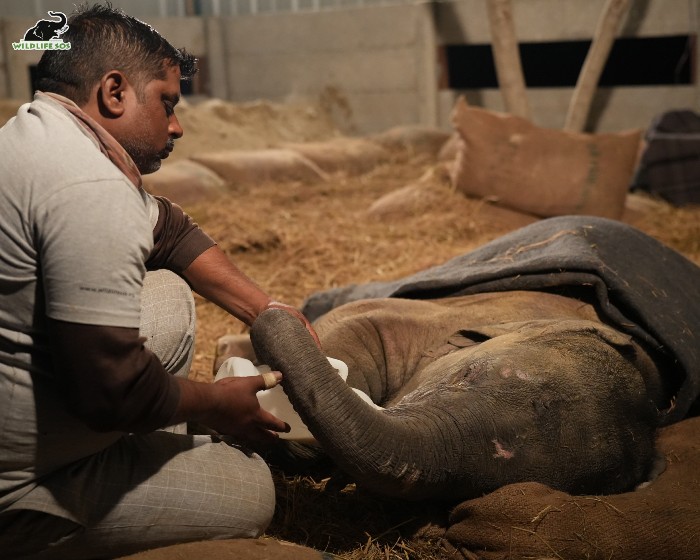 Bani is being given a milk formula, the temperature of which is matched with Bani’s body temperature. This is because the heat of her body would be at the same level as the milk of her mother would have been, and this helps to closely mimic the natural experience. Elephant calves are sensitive to this, and may reject the formula if there is a slight change in its temperature. Bani’s milk formula is therefore always lukewarm and never cold. Attention given to this aspect is a great way to promote a sense of security in her.