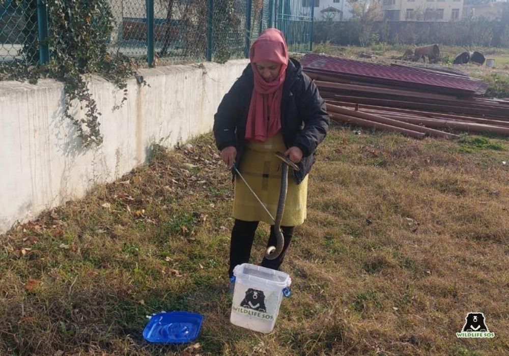 One particular incident occurred in the Nishad area concerning a reptile. A rat snake had slithered into a pile of stored firewood kept for heating traditional hamams, which are wood-fired bathing enclosures commonly used to withstand the harsh weather. When a resident noticed the snake while removing the logs, Wildlife SOS’s Rapid Response Unit was immediately alerted. The team carefully extricated the non-venomous snake and safely released it into a suitable habitat.