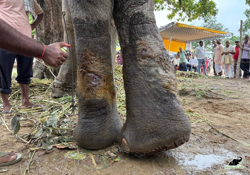 - The spiked chains that injured Hari’s hind leg have left painful wounds, which our team is carefully treating. [Photo © Wildlife SOS/ Vineet Kumar Singh]