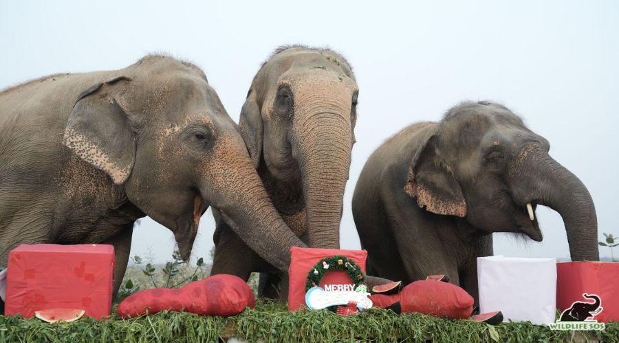 Christmas sprinkles of joy at MLRC and ABRF were matched by the festivities at our Elephant Care and Conservation Centre (ECCC) and Elephant Hospital Campus (EHC). The majestic giants under our care expressed thrill with their trumpets when they came across big boxes containing tasty treats!