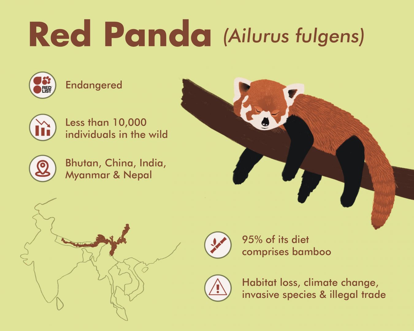 Known for its plant-heavy diet, the Red panda can be found in the north-eastern parts of India, as well as in Nepal, Bhutan, Myanmar, and China. The Himalayan flagship species is categorised as Endangered on the IUCN Red List. While it primarily feeds on leaves and shoots of bamboo, the animal may also consume fruits, roots, eggs, small mammals, and insects. In fact, the name ‘panda’ is derived from the Nepali word ‘ponya’, which means plant-eating animal. Although the Giant panda also heavily feeds on the plant, it is not genetically related to the Red panda.