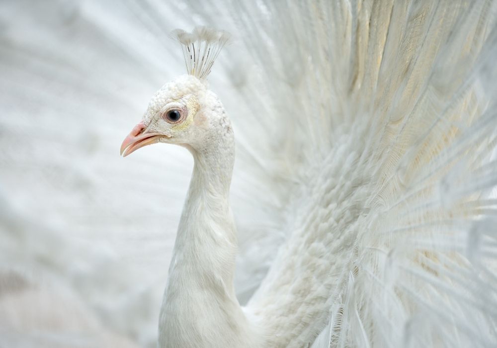 - Unlike the vibrant blue and green plumage of its counterpart, the leucistic peacock displays an ethereal palette of white feathers due to partial loss of pigmentation, not to be confused with albinism. [Photo © Canva]