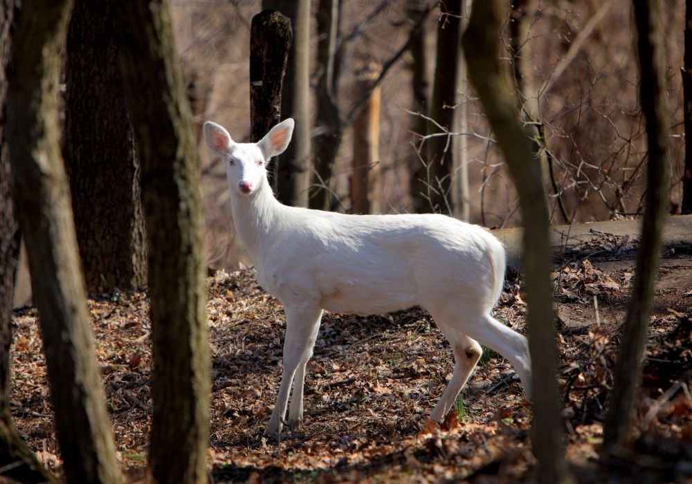 - With a pink nose, pale coat, and crimson eyes, this albino deer stands out starkly against the forest floor — its lack of melanin making it hauntingly beautiful, yet vulnerable in the wild. [Photo © Canva]