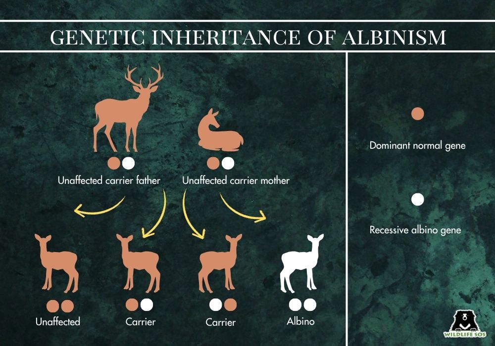 - Albinism is inherited through a recessive pattern, requiring both parents to carry the gene. For instance, when two carrier deer mate, there is a 25% chance their offspring will be unaffected, a 50% chance the offspring will be a carrier, and a 25% chance it will be an albino. [Infographic © Wildlife SOS/Aditya Mitra]